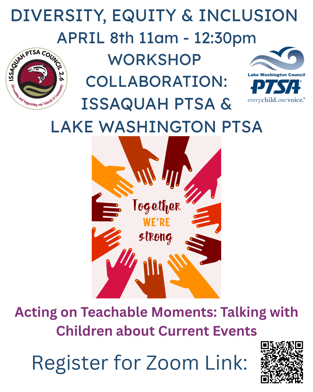 Issaquah PTSA Council Diversity, Equity and Inclusion Team is partnering with Lake Washington PTSA Council to present this online workshop: Action on Teachable Moments: Talking with Children about Current Events. Registration Link: https://us06web.zoom.us/meeting/register/_u4hpCfFQMGwh1mK9LfCKQ#/registration