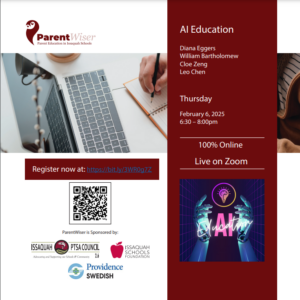 Come join us online for an evening with our ISD staff, parents and student representative to learning about the impacts of AI on our educational system and student learning environment. Learn how parents can work with their children to use AI appropriately with Diana Eggers (ISD Director of Educational Technology), William Bartholomew (Issaquah Parent & Director of Public Policy in Microsoft’s Office of Responsible AI), Cloe Zeng (Issaquah Parent & Chief Growth Officer at the Gottman Institute) and Leo Chen (senior at Skyline High School & Leader of the Skyline Web and AI Club).
