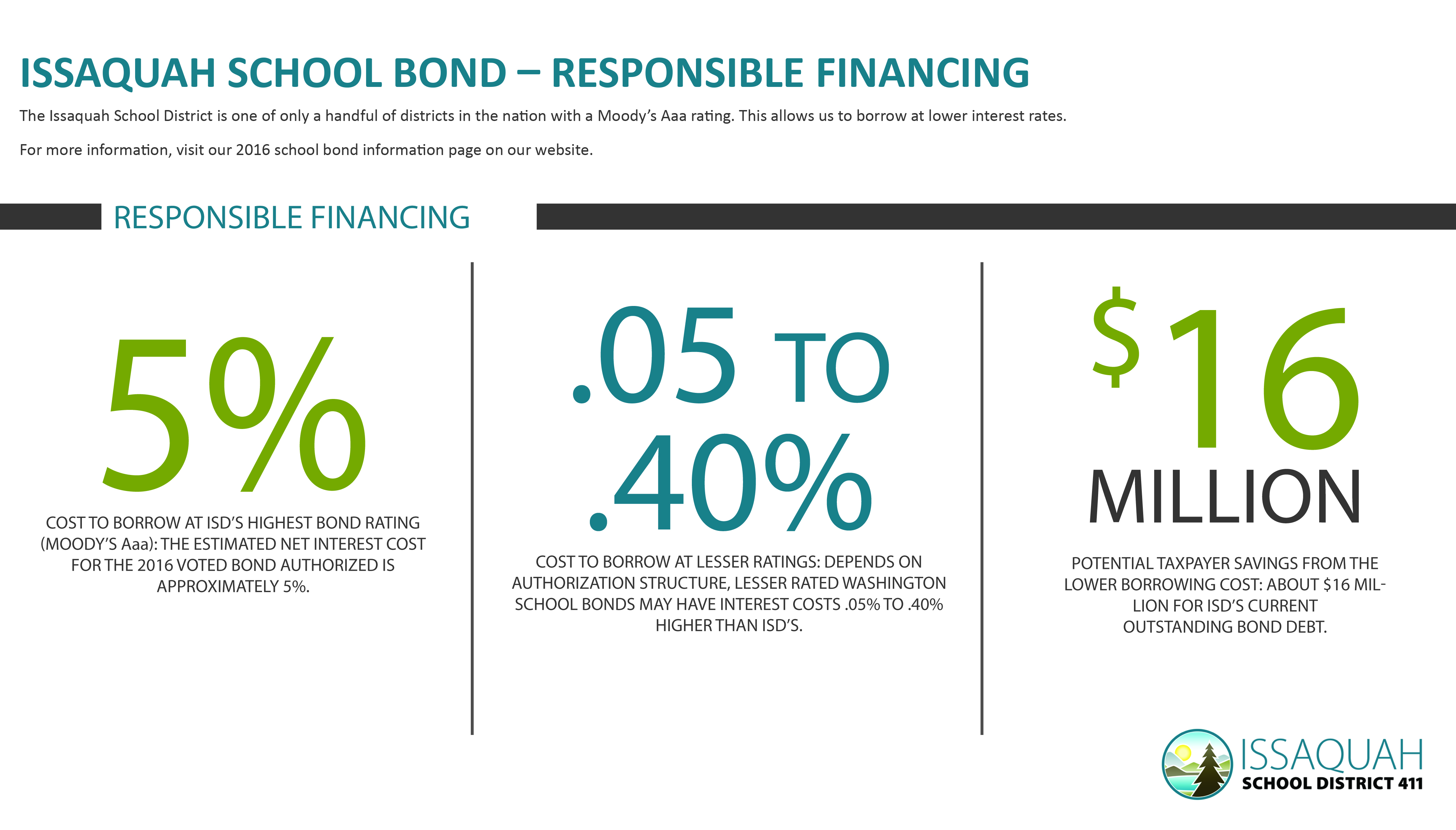 Issaquah School Bond – Responsible Financing: The Issaquah School District is one of only a handful of districts in the nation with a Moody’s Aaa rating and an S&P AA+ rating. Only 0.45% of school districts nationwide have this distinction! This allows the district to borrow funds at a lower interest rate and therefore save taxpayers money.