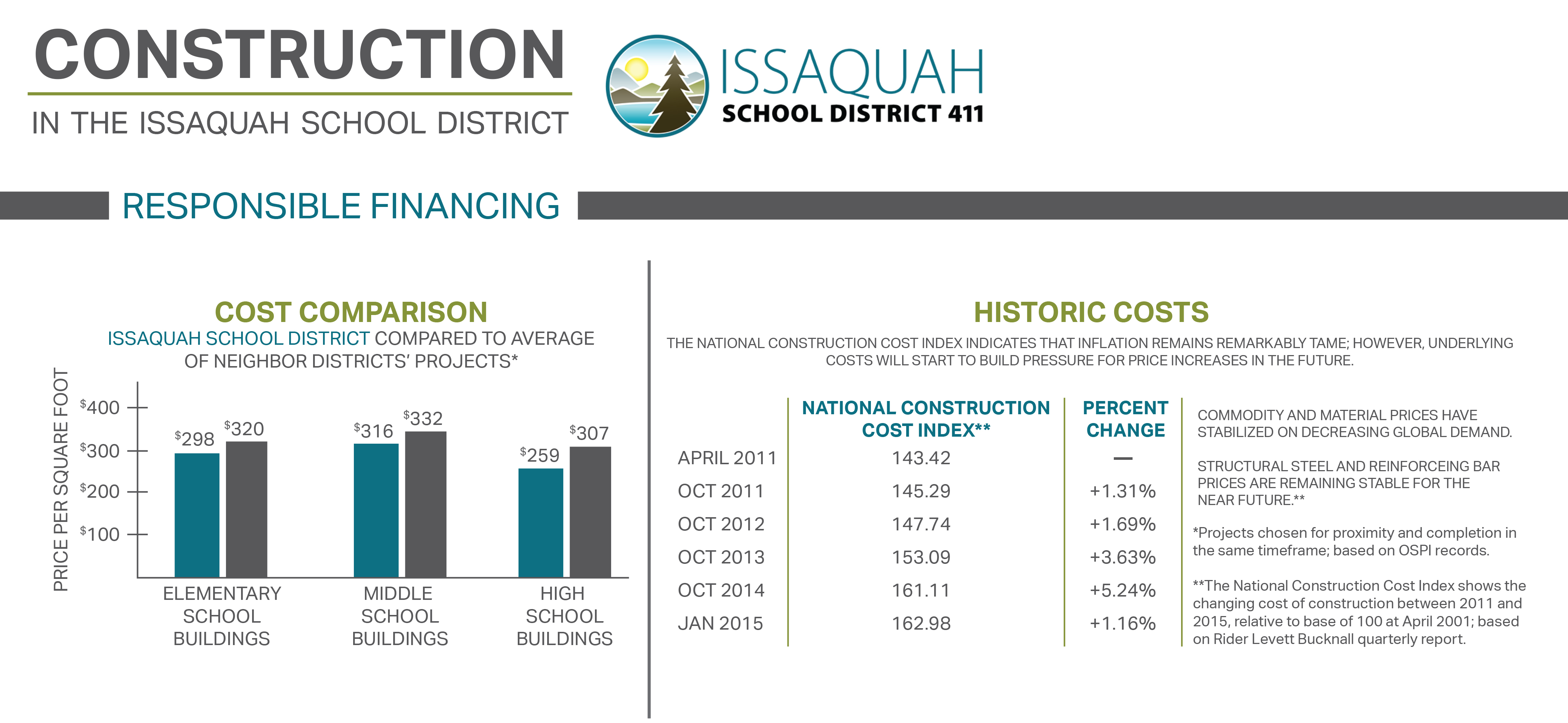 Issaquah School Bond – Cost Comparison:  The Issaquah School District builds top notch facilities at a cost per square foot that is on average lower than that of its neighboring districts.